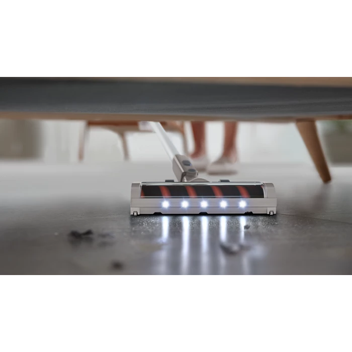 خاصية المكنسة الكهربائية المزودة بمصابيح LED: تُبرز مصابيح الـ LED الموجودة على الفوهة الأوساخ التي كانت غير مرئية سابقًا، مما يتيح لك رؤية الغبار والوبر والشعر والفتات بسهولة.